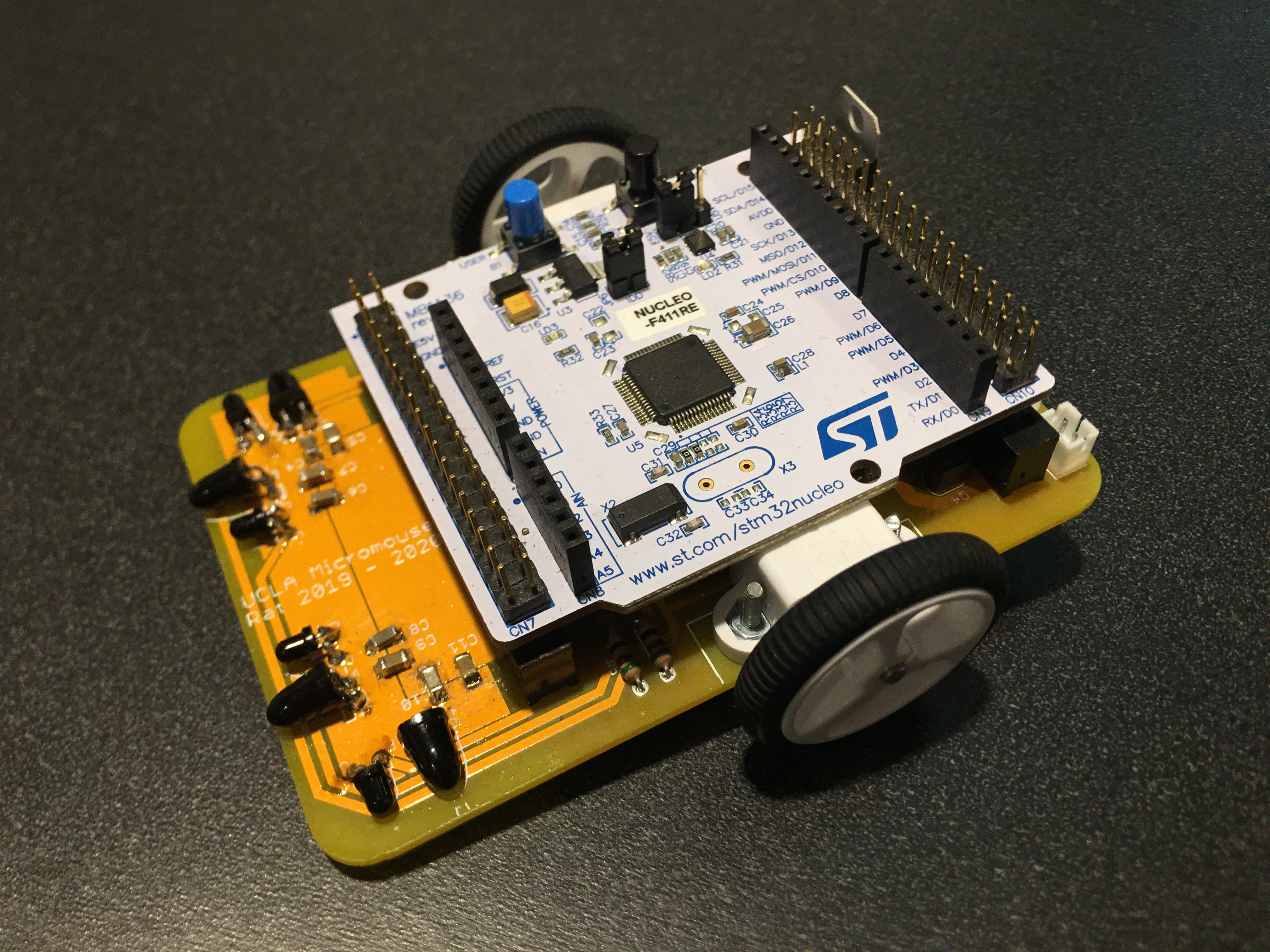 I have built two mice so far. The first one, a "rat," is a proven design provided by the Micromouse instructors in UCLA IEEE which allowed new Micromousers such as myself to learn the fundamentals. It is based off an ST Nucleo F411-RE development board and has a full sensor setup including four IRs and two encoders.